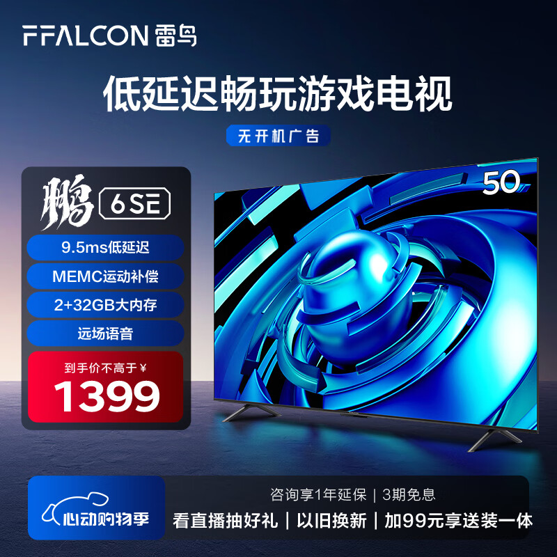 FFALCON雷鸟 鹏6SE 50英寸游戏电视 4K超薄屏 MEMC防抖 远场语音 2+32G 智能液晶平板电视机50S365C价格:1479.00元!