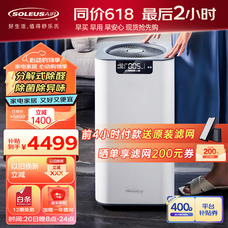 SOLEUSAIR舒乐氏空气净化器宠物除菌猫毛家用吸附除甲醛除花粉过敏原异味除甲醛分解除雾霾 等离子除菌A02价格:5099.00元!