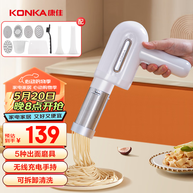 康佳(KONKA)面条机 家用压面机 手持压面枪 小型电动自动不锈钢压面条机 KMTJ-0401-W价格:139.00元!