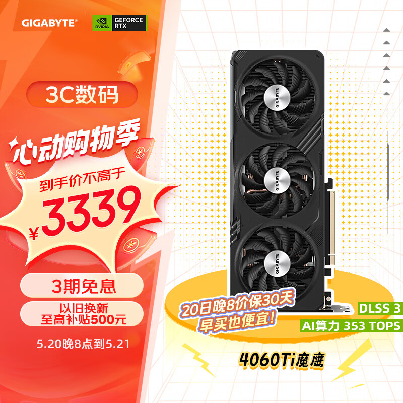 技嘉4060Ti显卡 魔鹰 GeForce RTX 4060 Ti GAMING OC 8G DLSS3 电竞游戏设计智能学习电脑独立显卡2K价格:3499.00元!