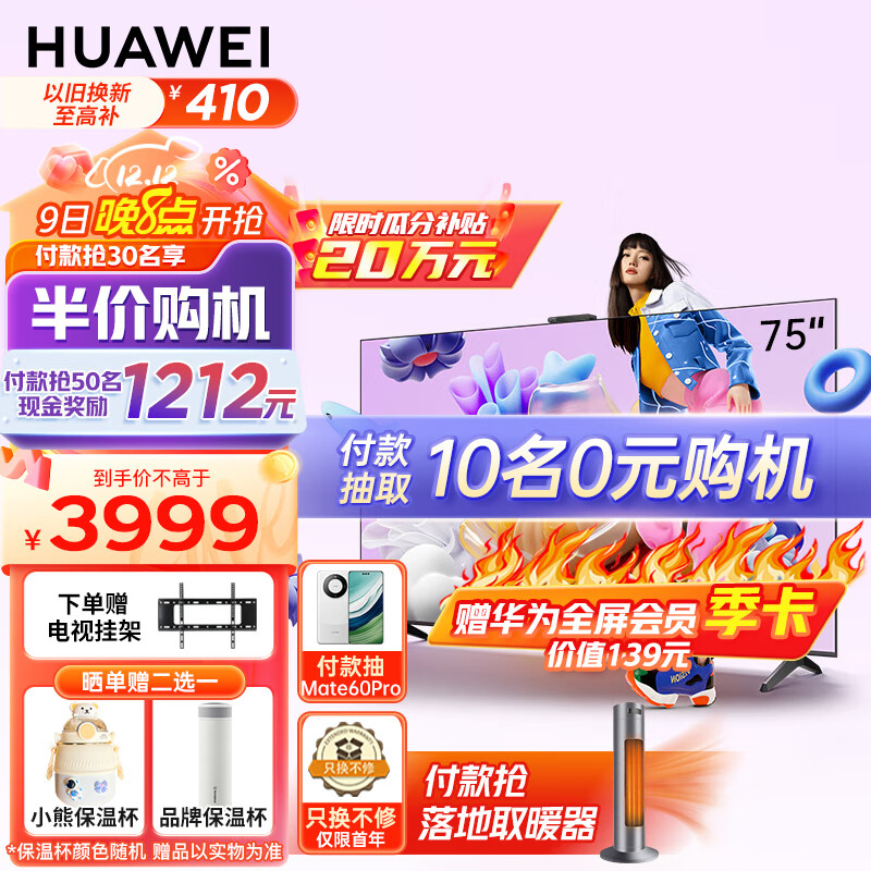 华为电视智慧屏Vision SE3 75英寸120Hz鸿鹄画质4K超高清AI摄像头护眼电视机mate60超级投屏HD75KUNA价格:3999.00元!