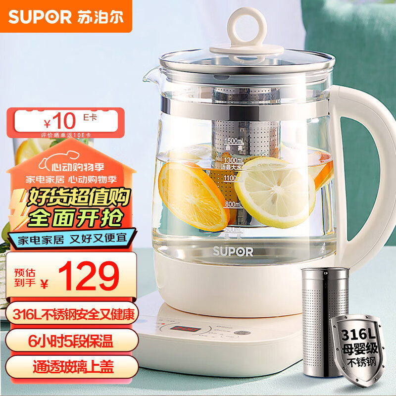 苏泊尔(SUPOR)1.5L养生壶热水壶 煮茶器煮茶壶电水壶恒温电热水壶 316L不锈钢保温花茶壶烧水壶带滤网 SW-15YJ36价格:129.00元!