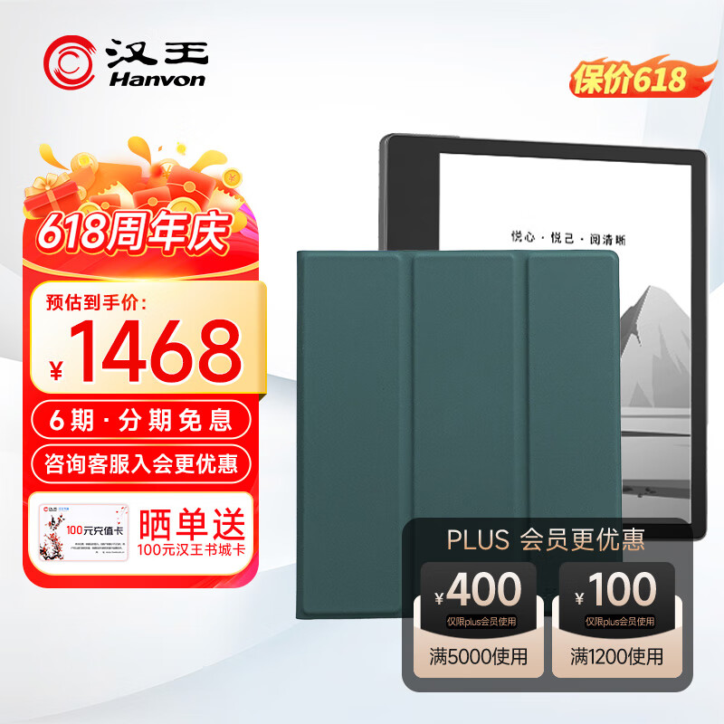 汉王(Hanvon) Clear 7英寸电子书阅读器 墨水屏电纸书看书学习便携阅读办公本4+64版贤春绿支架保护套.套装价格:1468.00元!