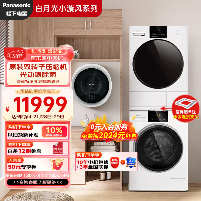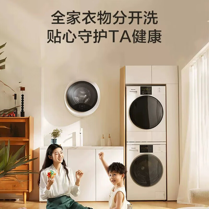 松下(Panasonic)白月光2.0+小漩风 10kg滚筒洗衣机+变频热泵烘干机 家用母婴壁挂洗烘CP套装 3E1AK+EH1015+A500W价格:11999.00元!