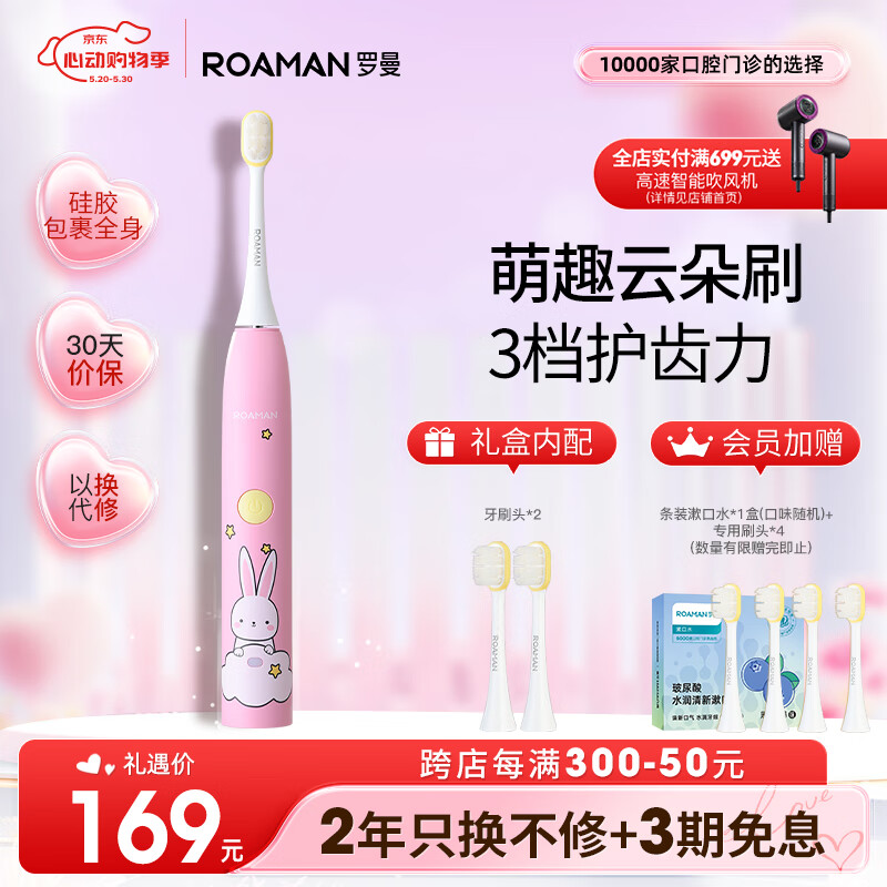 罗曼(ROAMAN)智能儿童电动牙刷 声波震动食品接触级材质充电式乳牙硅胶刷头6-12岁 K8-Z可爱粉价格:169.00元!