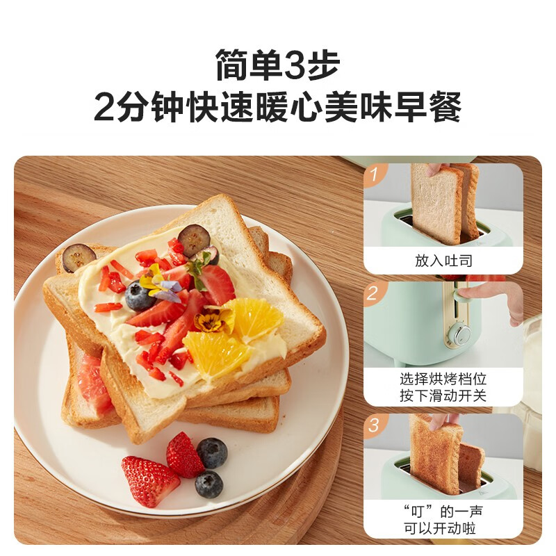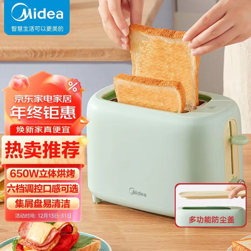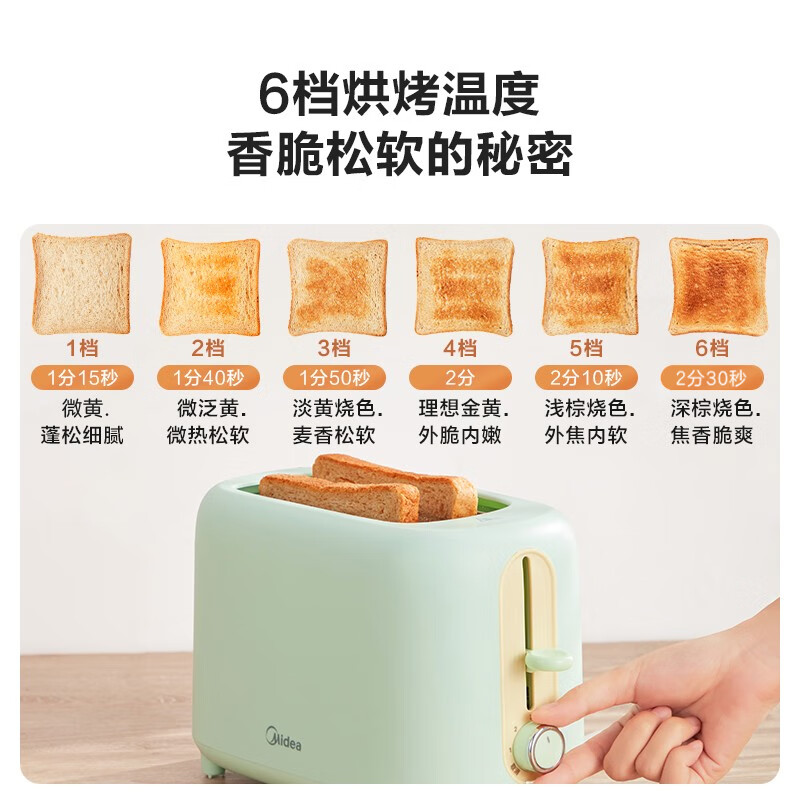 美的(Midea)多士炉面包机烤三明治面包片机全自动家用小型不锈钢内胆2片吐司机早餐智能断电机E1301 6档烘烤价格:89.00元!