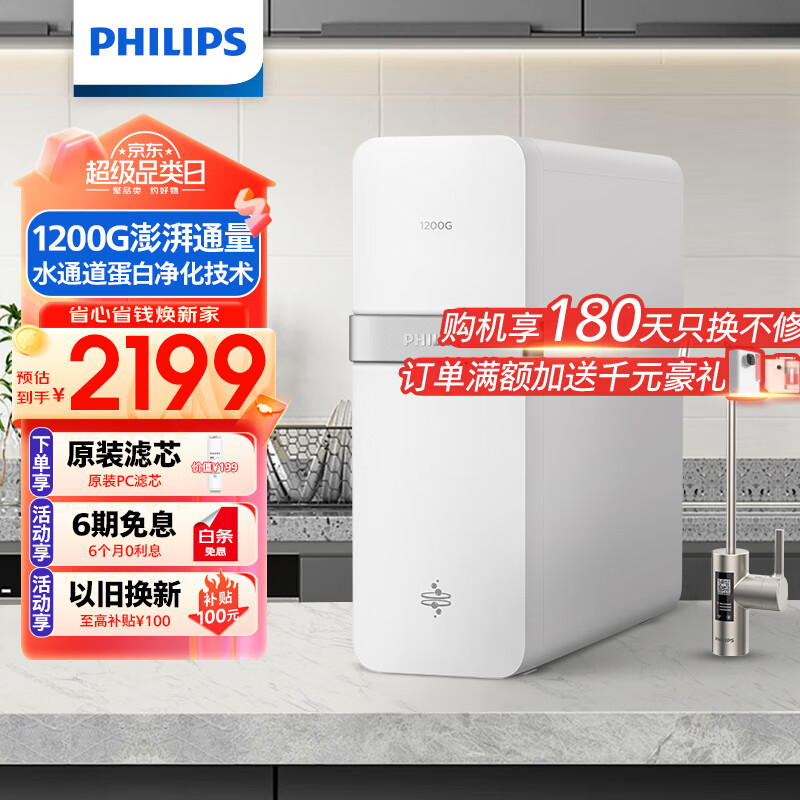 飞利浦(PHILIPS)净水器家用净水机 1200G5年RO反渗透 母婴直饮3.1L/min流速双出水净水器AUT7027价格:2199.00元!