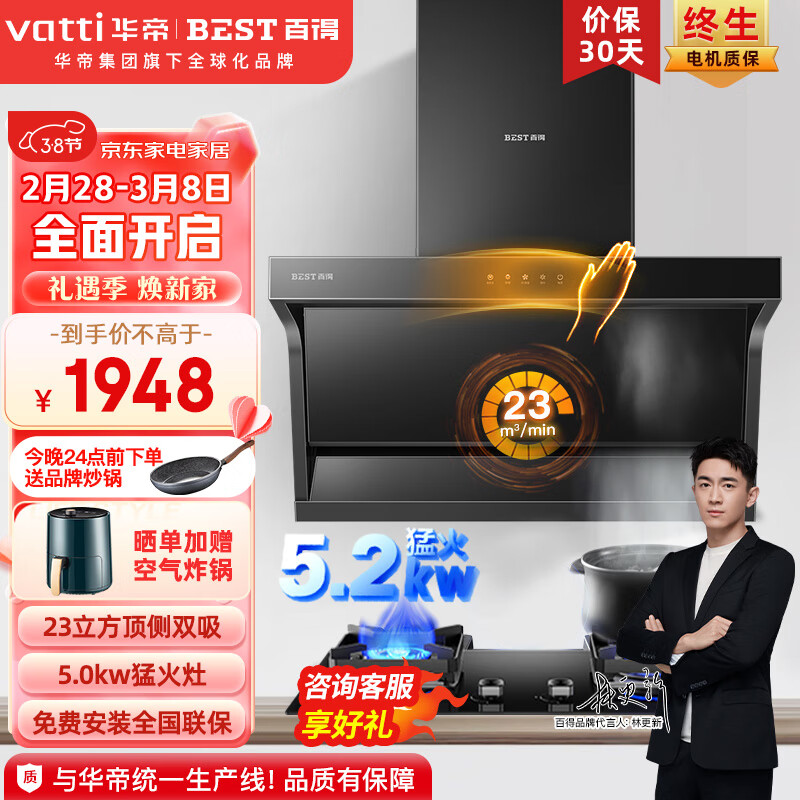 百得(BEST)华帝出品 顶侧双吸油烟机燃气灶具套装 23立方大吸力挥手感应自动洗 E600+QE50(液化气)价格:2148.00元!