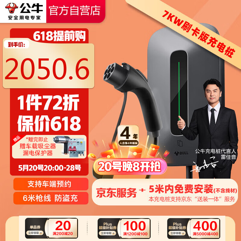 公牛新能源汽车交流充电桩适配于小米su7汽车比亚迪极氪蔚来特斯拉问界小鹏理想 7KW刷卡款 送基础安装价格:2849.00元!