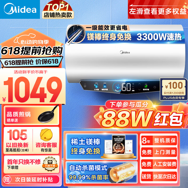 美的(Midea)终身免换镁棒60升电热水器家用储水式3300W速热大水量一级能效APP低耗节能自动杀菌F6033-JE5(HE)价格:1049.00元!