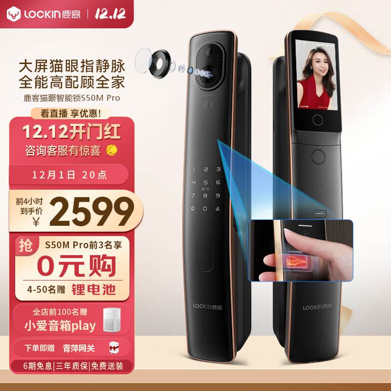 鹿客(LOOCK)S50MPro琥珀金可视猫眼室内大屏指静脉智能锁指纹锁支持APP联动价格:2899.00元!