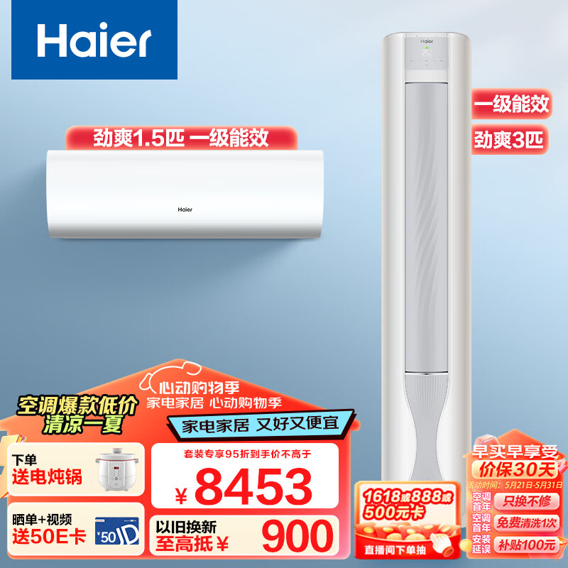海尔(Haier)劲爽系列 冷媒变流 新一级变频冷暖空调 一室一厅空调套装 (1.5匹挂机+3匹柜机) 以旧换新价格:8453.00元!
