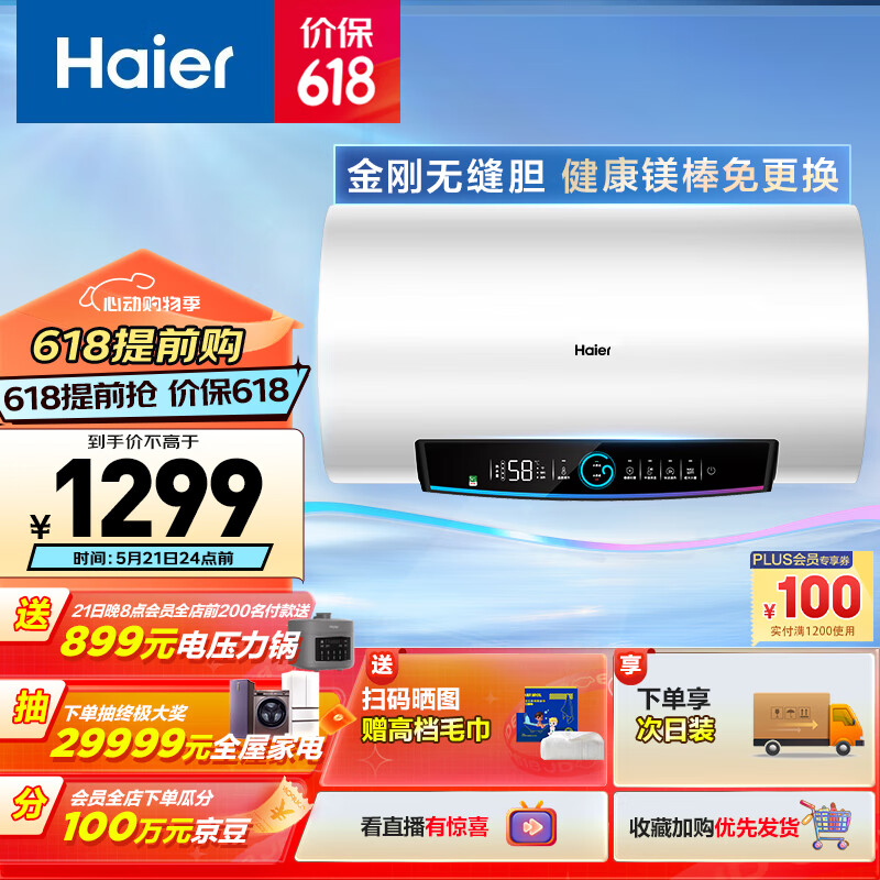 海尔(Haier)60升【金刚无缝胆】瓷净3300W变频大功率速热家用储水式电热水器 免换镁棒健康可视EC6002-PD5(U1)价格:1399.00元!