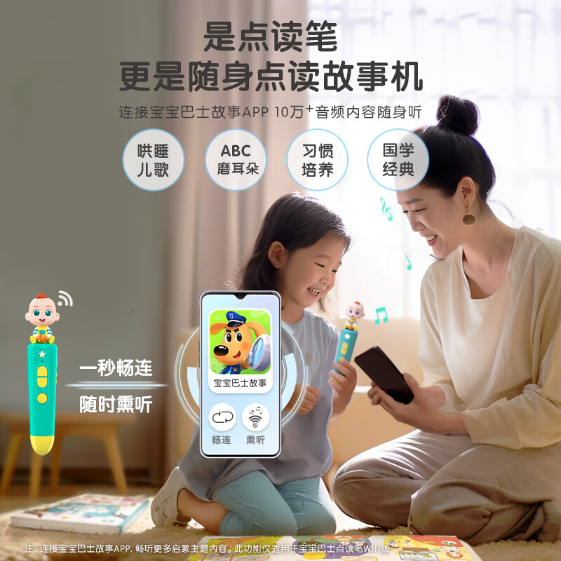 2、收到了,宝宝巴士的全家福套装里面的书真的好多呀,种类很丰富,这个点读笔是有Wi-Fi功能的可以在手机里面控制灯光的亮度或者关掉,真的太方便了!不仅有中文的,还有英文的,还有古诗,感觉宝宝启蒙有这一套就够了!!