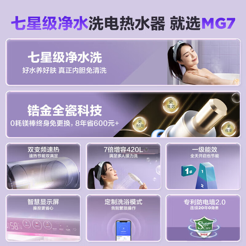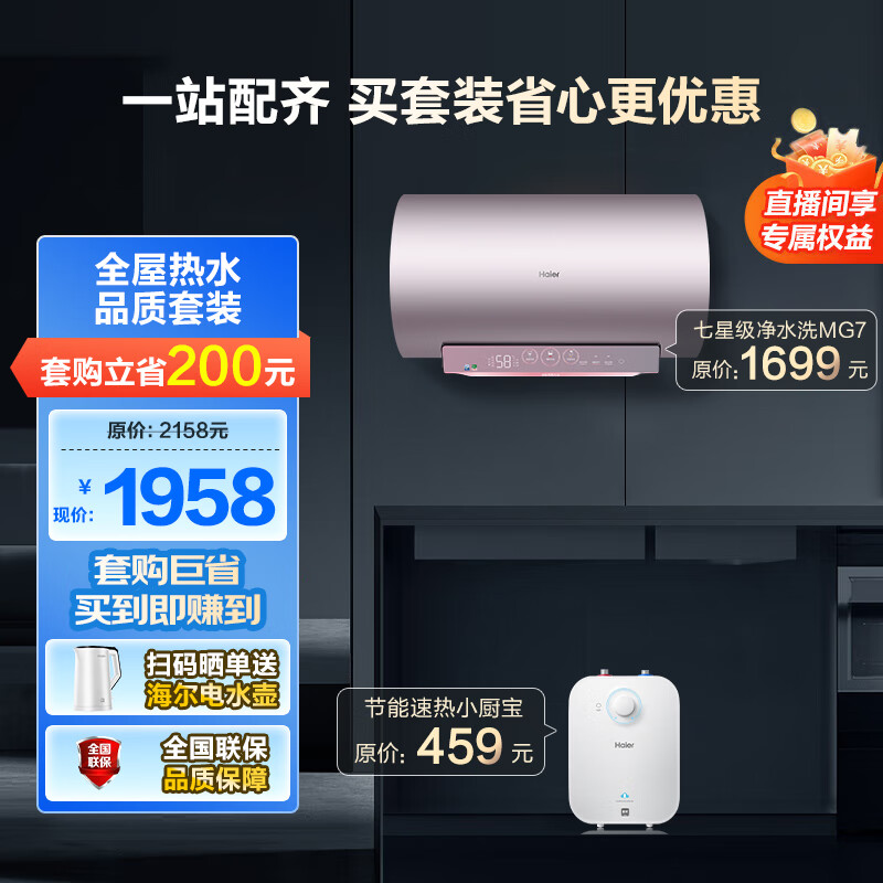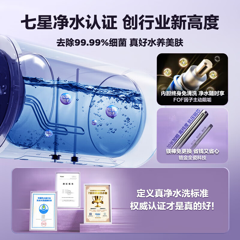 海尔(Haier)免清洗60升电热水器3300W变频速热美肤净水洗镁棒免更换 WiFi智控 EC6002-MG7(U1)【全屋热水】价格:1958.00元!