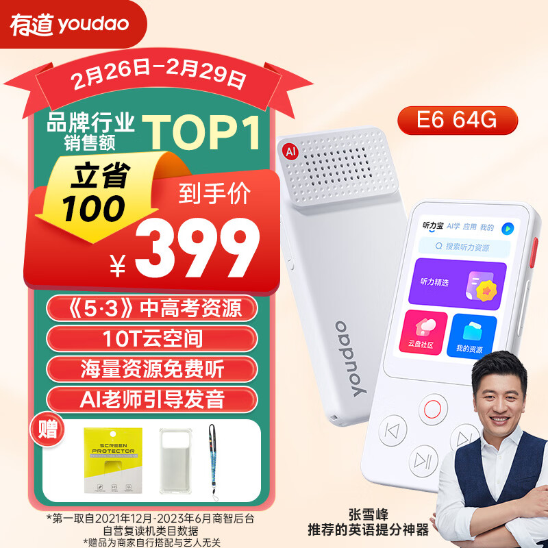 有道双语听力宝E6 复读机英语学习机随身听磨耳朵神器 听力训练小学初中学生听力机64G皓月白 YDLE6价格:499.00元!