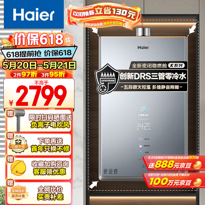 海尔(Haier)16升【K系列KT3】燃气热水器天然气 DRS真三管零冷水 五段微火控温 一级静音JSQ31-16KT3FRXGU1价格:3099.00元!