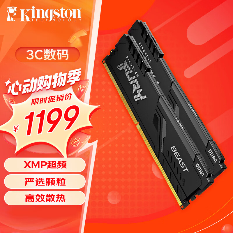 金士顿 (Kingston) FURY 64GB(32G×2)套装 DDR4 3200 台式机内存条 Beast野兽系列 骇客神条价格:1199.00元!