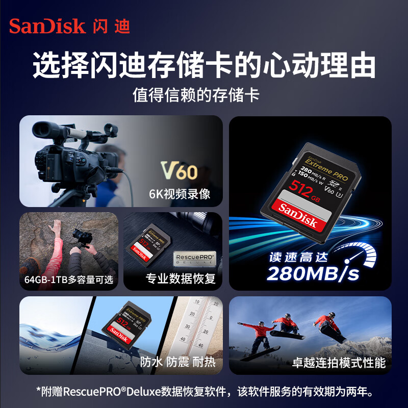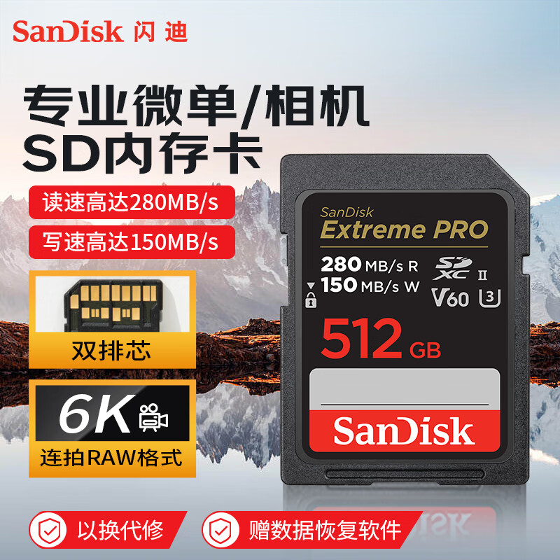 闪迪(SanDisk)512GB V60 SD存储卡U3 C10 6K高速相机内存卡 读速280MB/s 写速150MB/s 高清拍摄 畅快连拍价格:2399.00元!