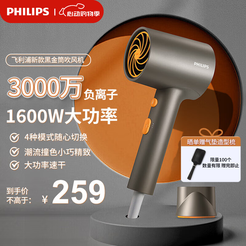 飞利浦吹风机家用大功率吹风筒3000万负离子电吹风 520情人节礼物 黑金筒价格:499.00元!