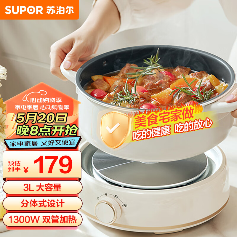 苏泊尔(SUPOR)电火锅 多功能电煮锅 火锅专用锅 分体式家用电热锅 3升多用途锅H22YK855价格:179.00元!