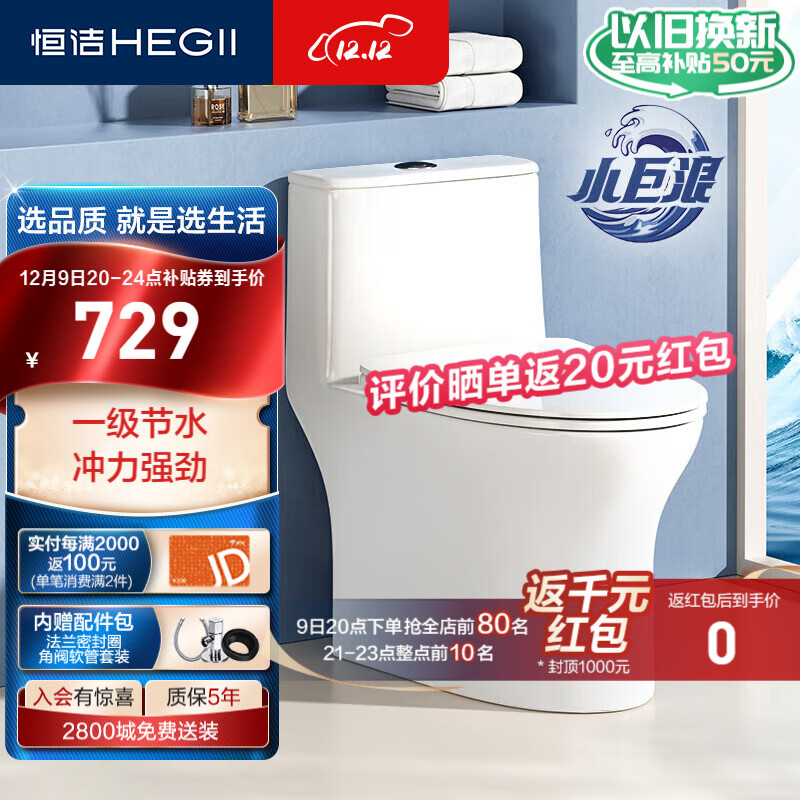 恒洁(HEGII)马桶513 家用虹吸小巨浪马桶节水小户型卫生间坐便器HC0513PT-305价格:1029.00元!
