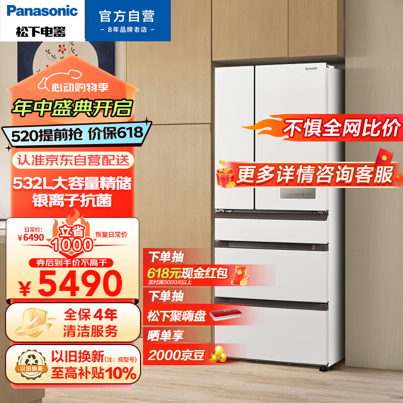松下(Panasonic)532升家用大容量多门冰箱 银离子kang菌 变频无霜风冷NR-JE54WGC-W价格:6490.00元!
