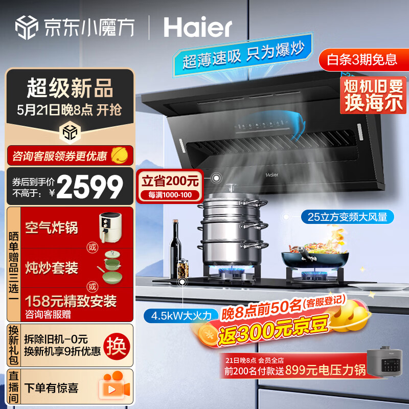 海尔(Haier)抽油烟机 顶侧双吸烟灶套装 变频25m3/min大吸力 挥手智控 家用油烟机燃气灶具套装C61+Q2BE2液价格:2799.00元!