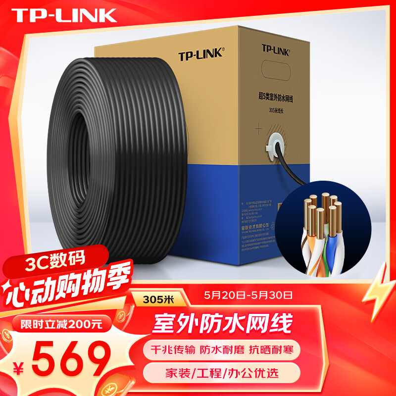TP-link超五类千兆网线室外防水 0.5无氧铜工程布线CAT5e类非屏蔽纯铜双绞线家装网络户外305米/箱 305AE价格:589.00元!