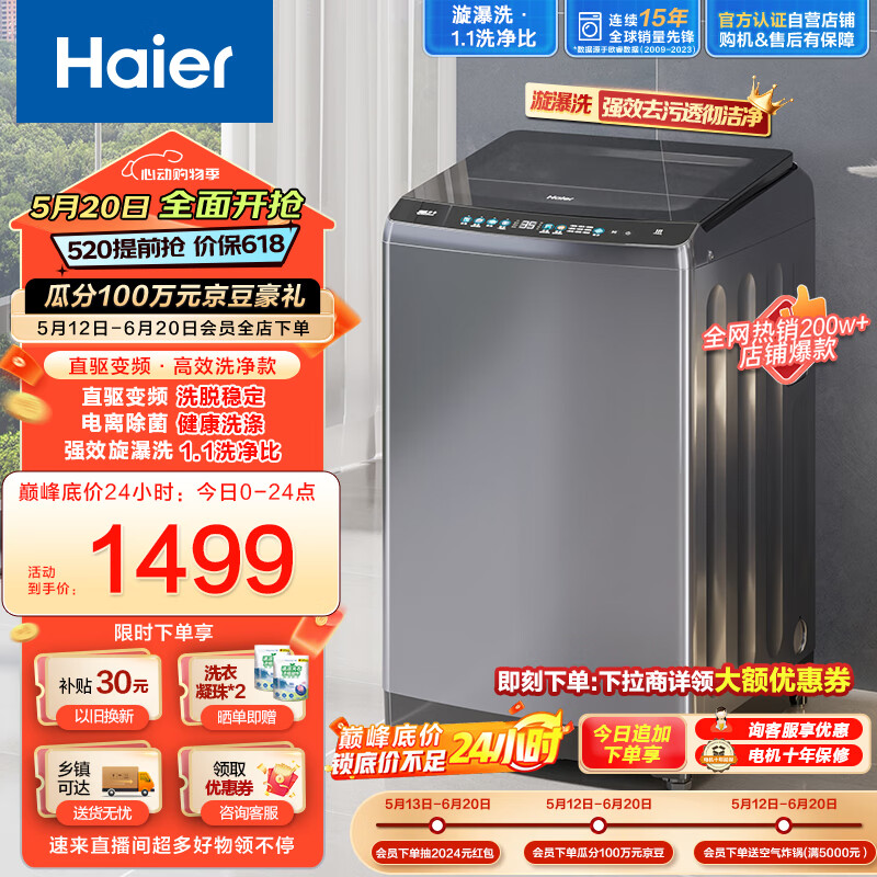 海尔(Haier)波轮洗衣机全自动家用 10公斤大容量 直驱变频一级能效 漩瀑洗高洗净比 以旧换新EB100B26Mate3价格:1499.00元!