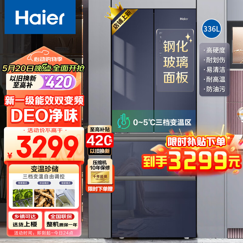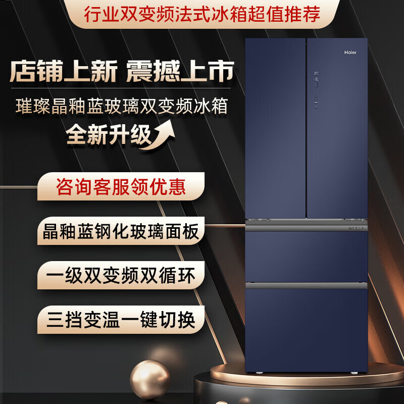 海尔(Haier)336升一级能效双变频风冷无霜法式多门家用超薄变温钢化玻璃面板大容量冰箱价格:3299.00元!