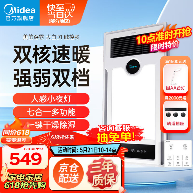 美的(Midea)浴霸风暖排气扇照明一体浴室暖风机集成吊顶双核取暖器卫生间灯价格:649.00元!