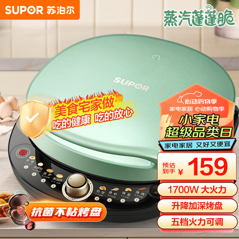 苏泊尔(SUPOR)电饼铛 电饼档 家用煎烤机烙饼锅 早餐机 火力可调蒸汽烤肉薄饼机升降烤盘 1700W火力 JD30AQ850价格:159.00元!