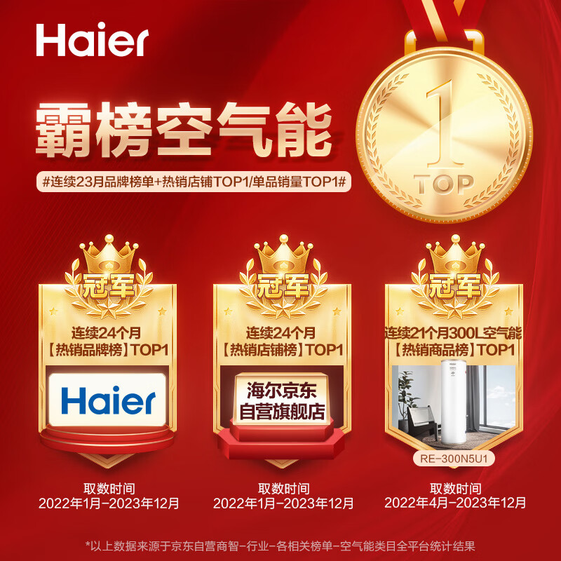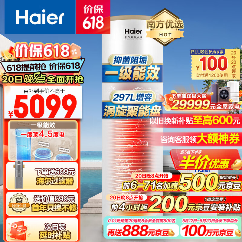 海尔(Haier)空气能热水器200升包安装 一级能效杀菌阻垢净水洗升级R32冷媒水电分离WIFI智控 JA7C(2-4人)价格:5099.00元!