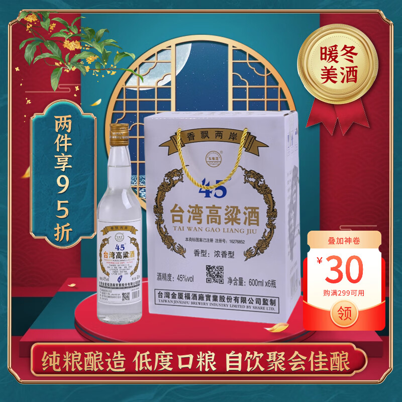 五缘湾台湾高粱酒浓香型白酒45度600ml*6整箱厦门高粱口粮酒价格:89.00元!