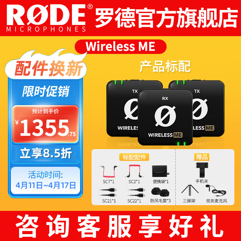 RODE 罗德Wireless ME麦克风无线领夹收音单反手机无线小蜜蜂采访电脑直播外拍vlog Wireless ME一拖二价格:1595.00元!