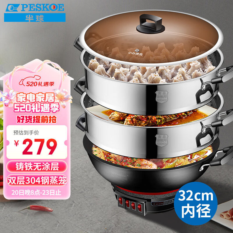 半球(Peskoe)电蒸锅多功能电热锅 32CM电炒锅电锅多用途锅铸铁锅身双层蒸笼 JF-32(BQ-32ATSL)价格:279.00元!