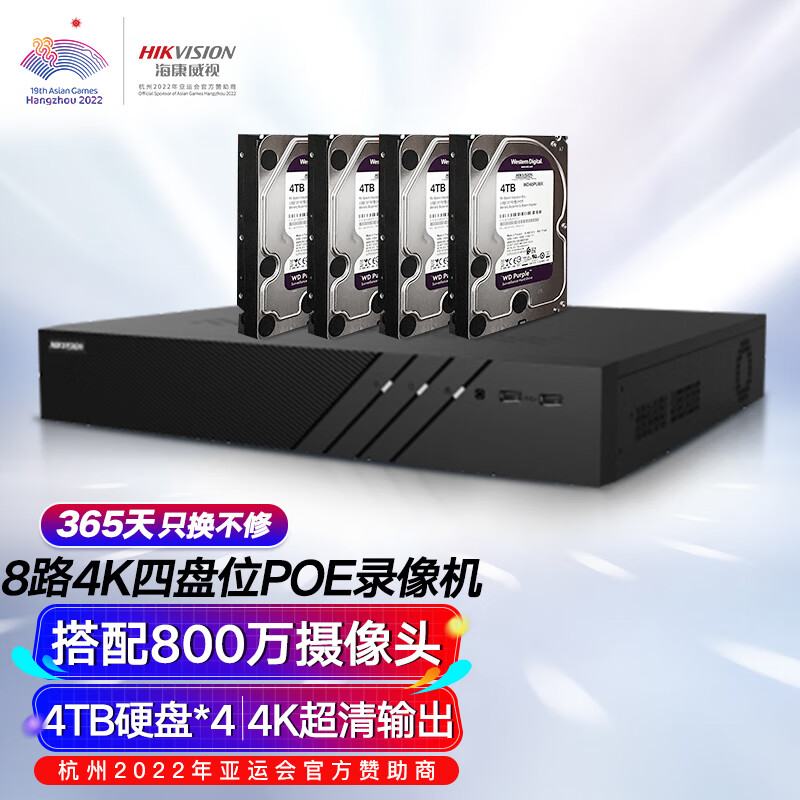 海康威视网络硬盘录像机监控8路POE网线供电NVR满配8个摄像头带4T硬盘DS-7908N-R4/8P价格:4914.00元!
