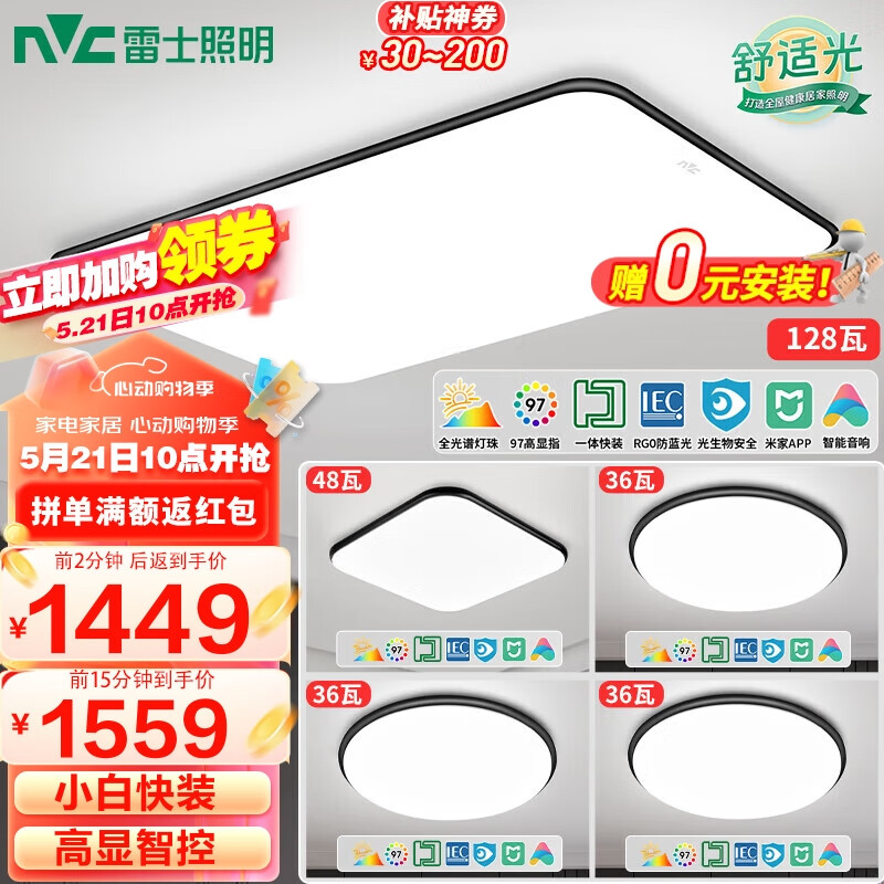 雷士(NVC)吸顶灯客厅大灯现代led照明全屋米家智能套餐小白灯黑潮S舒适光价格:2747.00元!