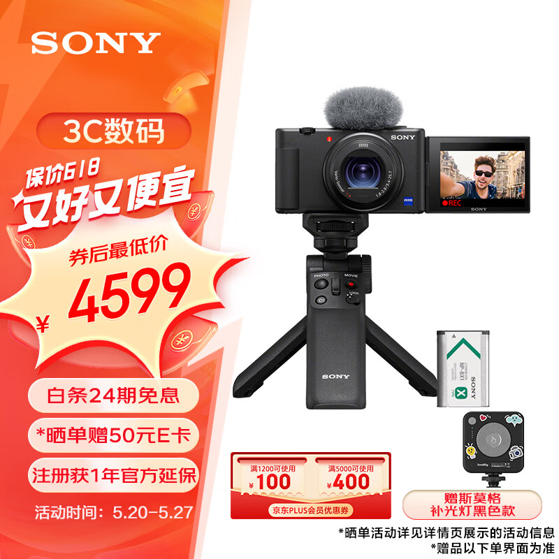 索尼(SONY)ZV-1数码相机 手柄电池套装黑色 小巧高颜值/美肤/强悍对焦/大变焦/入门/4K视频/Vlog ZV1价格:4998.90元!