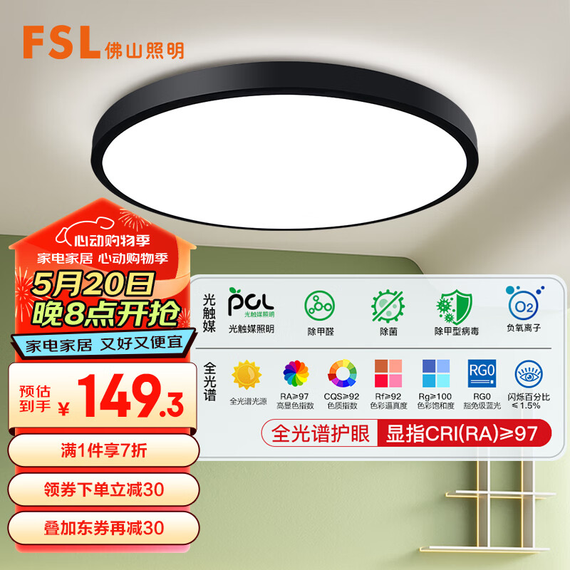 FSL佛山照明全光谱护眼吸顶灯光触媒卧室灯豁免级蓝光Ra97绅士黑36W价格:299.00元!