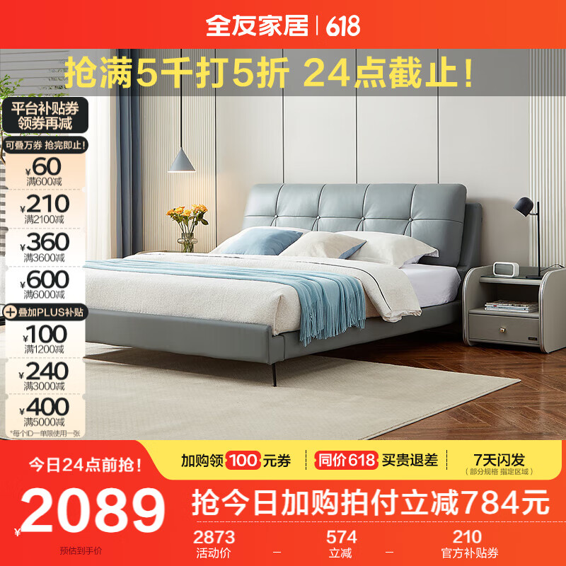 全友家居 真皮艺双人床现代简约主卧室头层牛皮软包床1.5x2米105135价格:2873.75元!