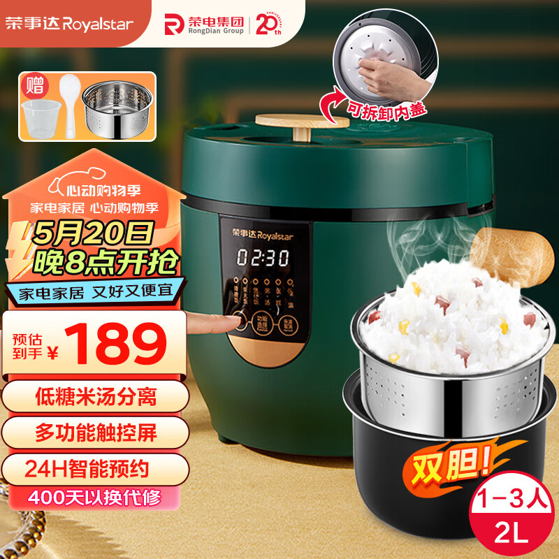 荣事达低糖电饭煲家用米汤分离小型多功能养生智能预约全自动沥米饭降低还原糖2L升迷你电饭锅RFB-S20B1价格:199.00元!