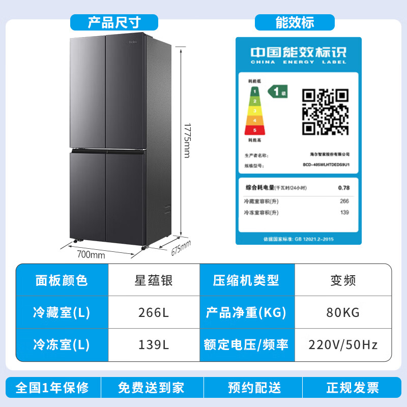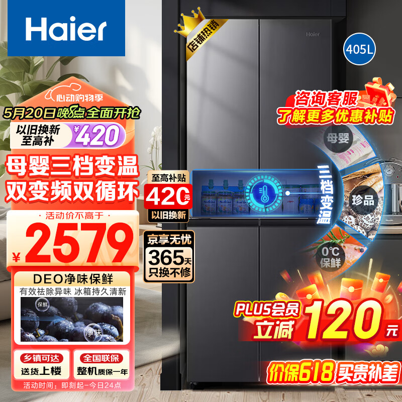 海尔(Haier)405升一级能效双变频十字双开四开多门家用超薄冰箱 净味保鲜母婴专属空间价格:2699.00元!