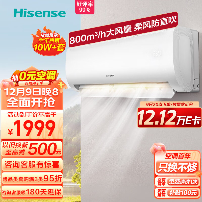 海信(Hisense)1.5匹 速冷热 新一级能效 大风量速冷暖 APP智能变频防直吹壁挂式卧室空调挂机 KFR-35GW/E370-X1价格:2098.00元!