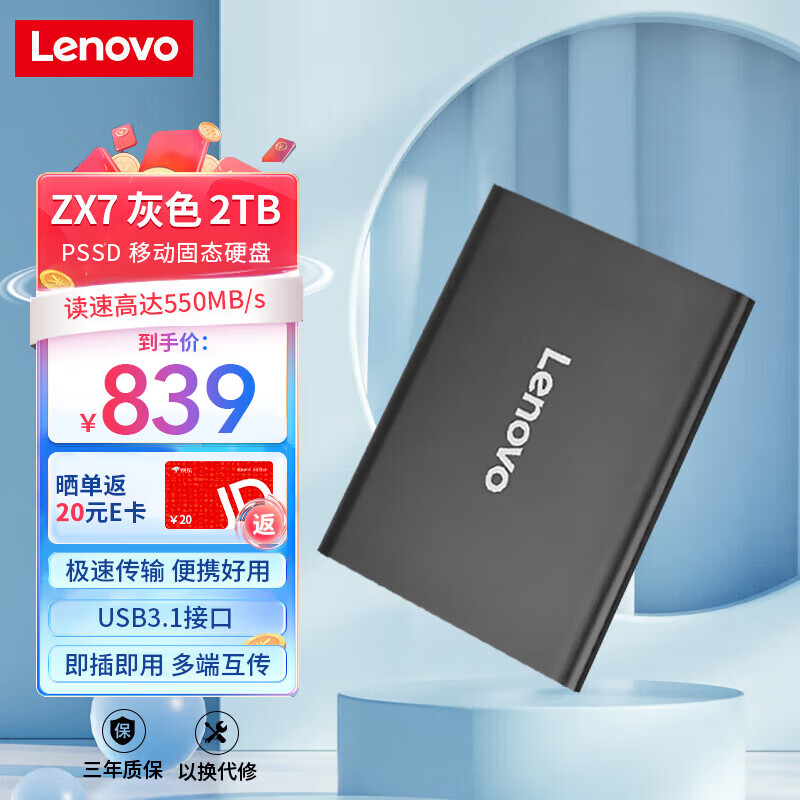 联想(Lenovo)2TB 移动固态硬盘(PSSD)Type-c USB3.1接口 手机直连 ZX7系列 灰色价格:839.00元!