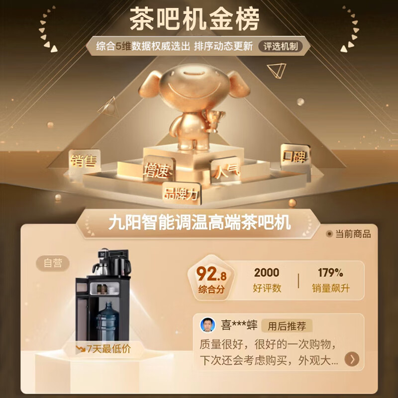 九阳茶吧机家用高端客厅用多功能智遥控大屏显示立式 一体饮水机 双口出水24小时保温-金色 【升级LED大屏显示】温热型价格:289.00元!