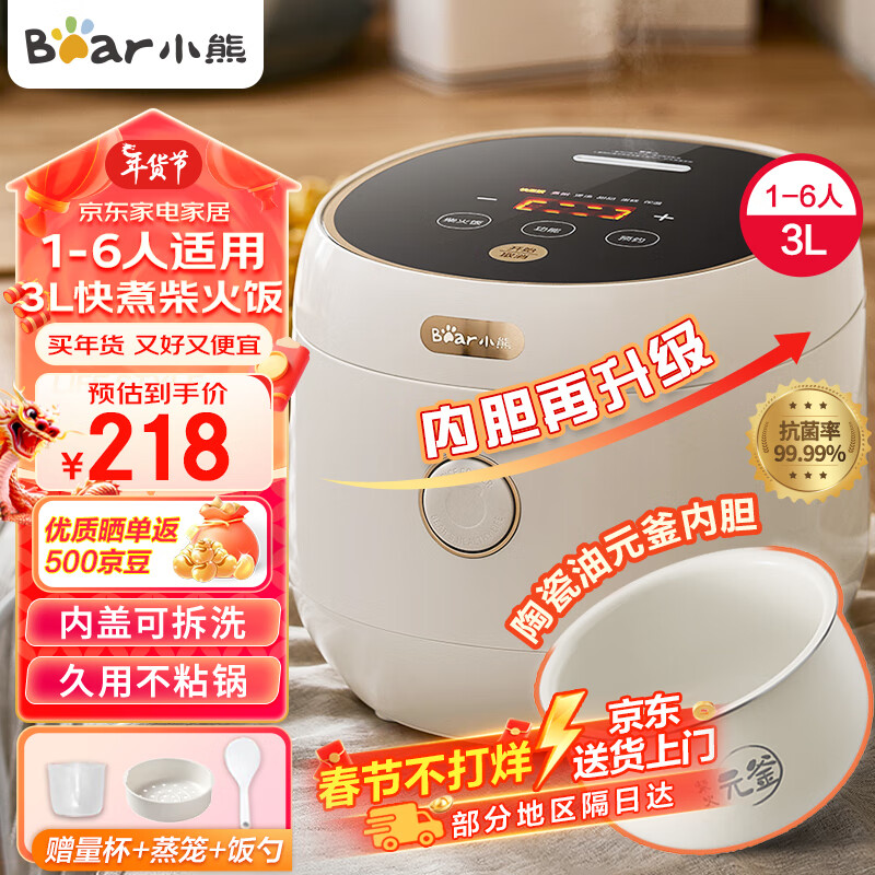 小熊(Bear)电饭煲 电饭锅 家用3-4个人多功能智能防溢预约陶瓷油元釜内胆柴火饭迷你不粘内胆米饭锅 新升级陶瓷油涂层内胆 3L价格:218.00元!