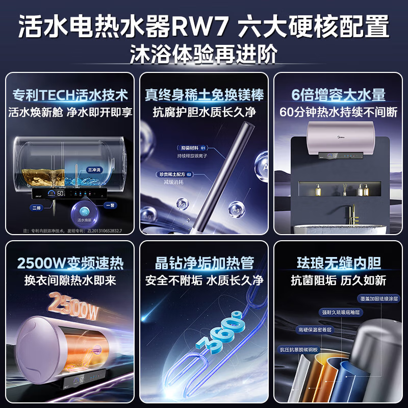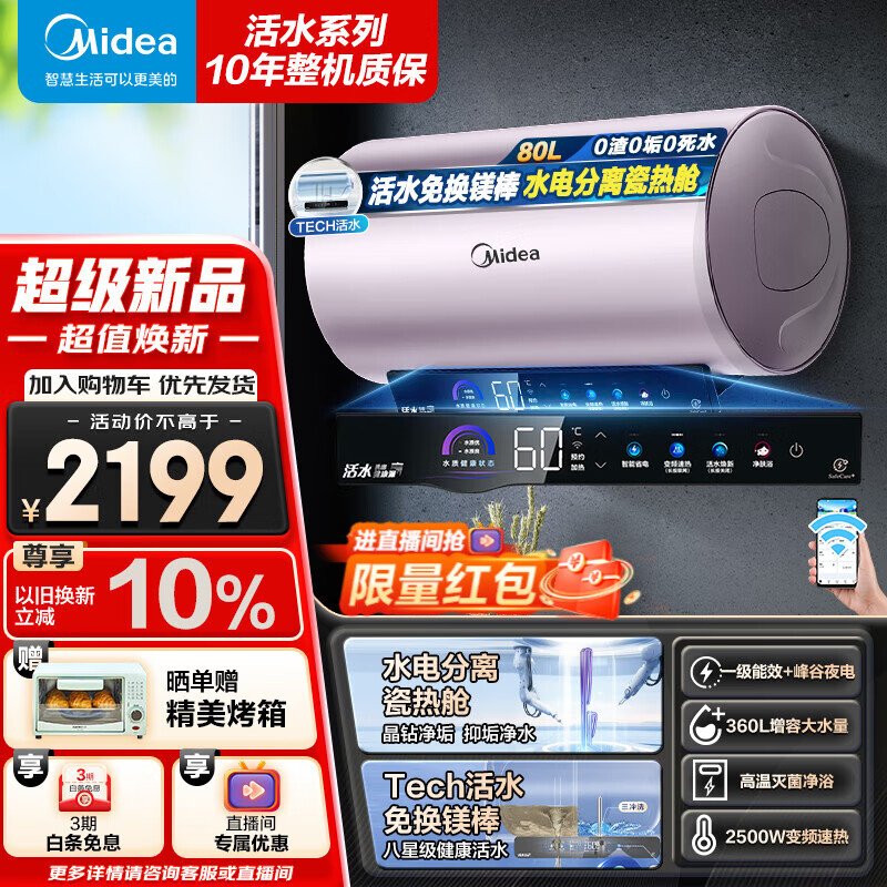 美的(Midea)储水式电热水器家用一级能效 繁星计划活水焕新舱 免换镁棒水电分离APP智能操控速热RW系列热水器 80L 2500W RW7变频速热净浴 一级能效价格:2499.00元!