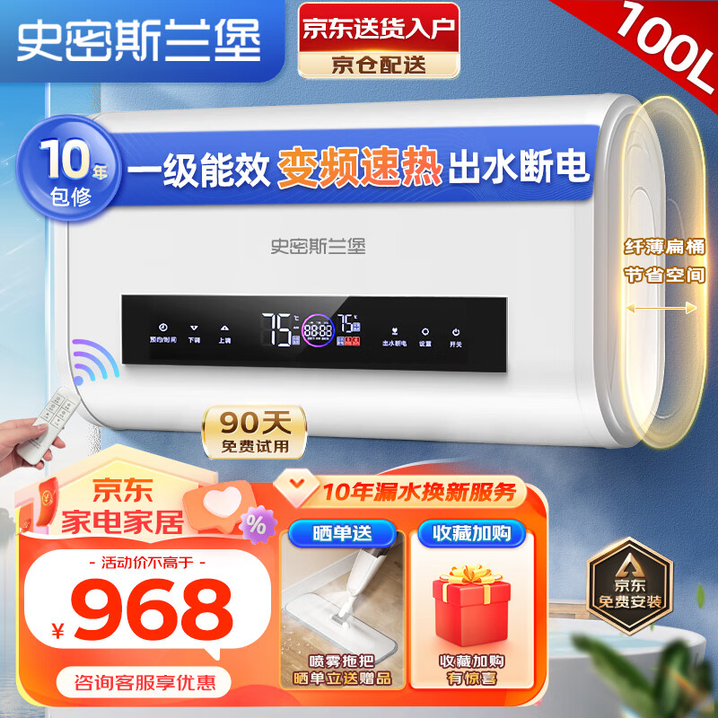 史密斯兰堡电热水器家用扁桶速热超薄储水式热水器出租房卫生间洗澡上门安装100升L变频双胆一级能效F-07D价格:968.00元!